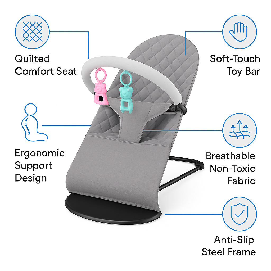 Ergonomic Recliner: Adjustable Tilt Angle (Usually 30°~60°) To Adapt To Baby’s Lying Down, Semi-Lying Position, Etc., To Avoid The Risk Of Choking.