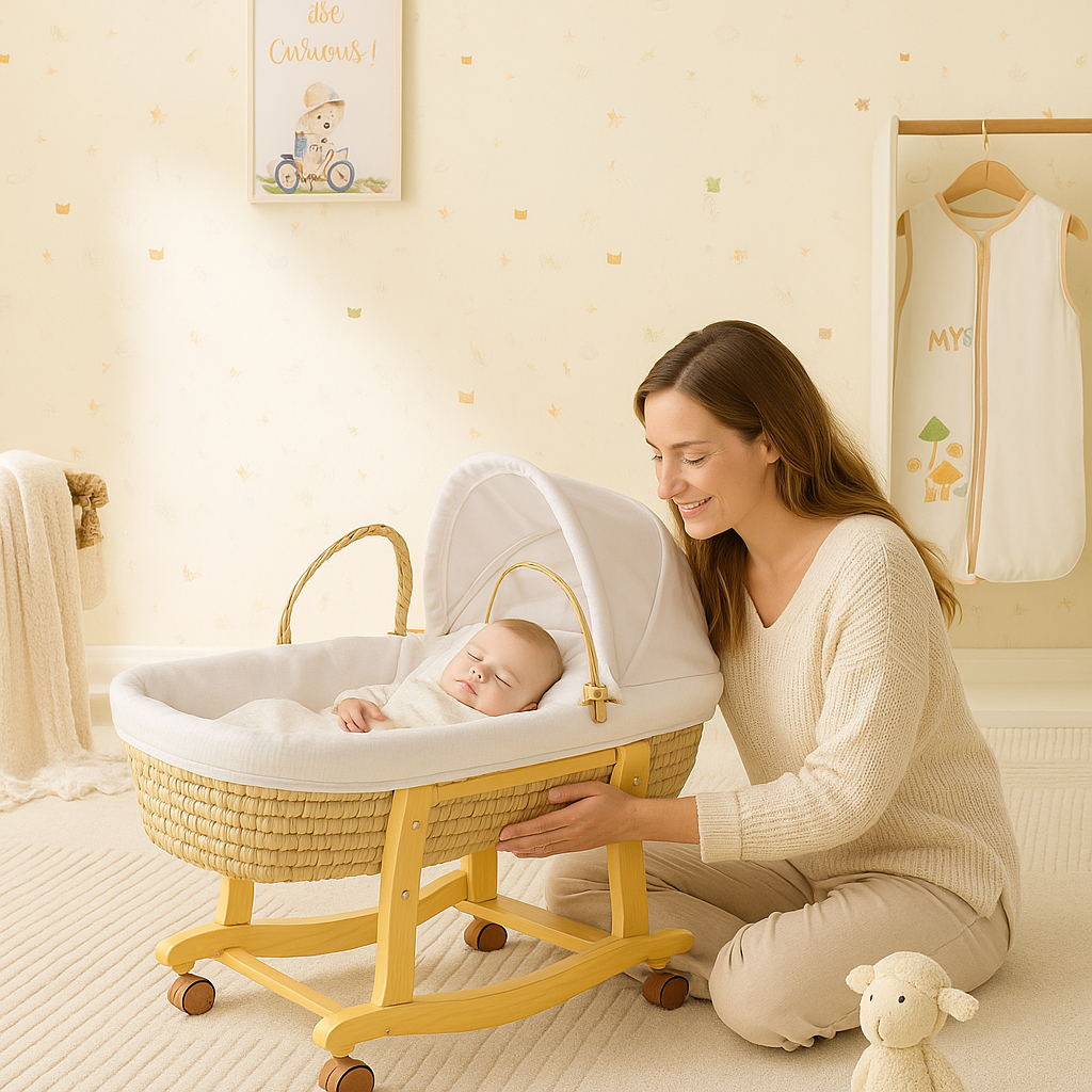 The Kikibebe Wooden Fun Moment Moses Basket offers a cozy and secure space for newborns, crafted from natural wood for durability and style.